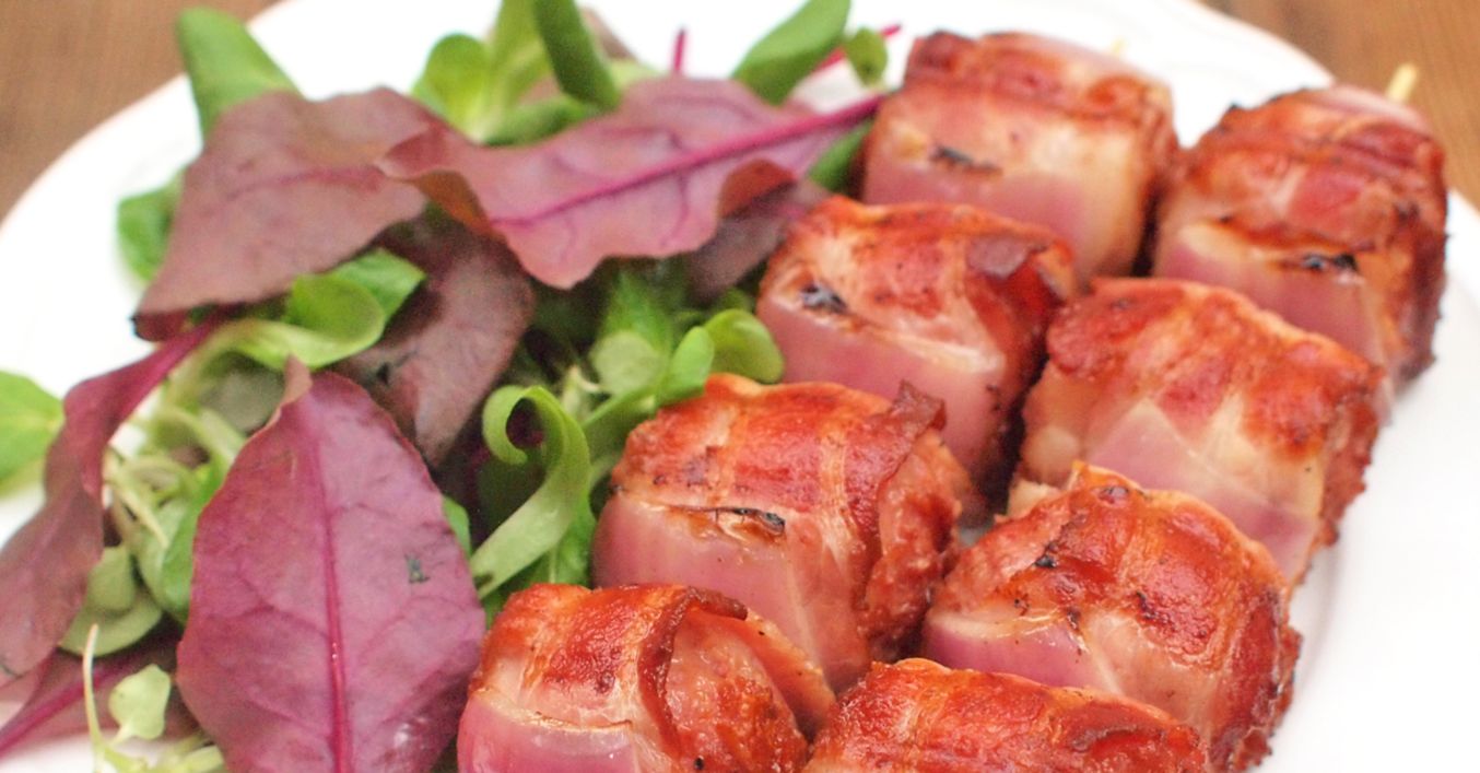 Navlhčenými dlaněmi vytvarujeme z masa menší kuličky. Každou kuličku poté zabalíme do slaniny a střídavě s cibulí napíchneme na špíz.
