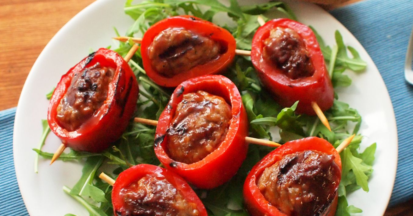 Paprikové kroužky poté grilujeme na rozehřátém grilu. Opékáme nejprve na straně s masem, poté i na straně s paprikou (dohromady asi 10 až 12 minut).