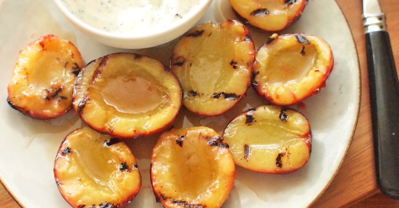 Grilované švestky zalijeme medem a podáváme spolu s makovým tvarohem.