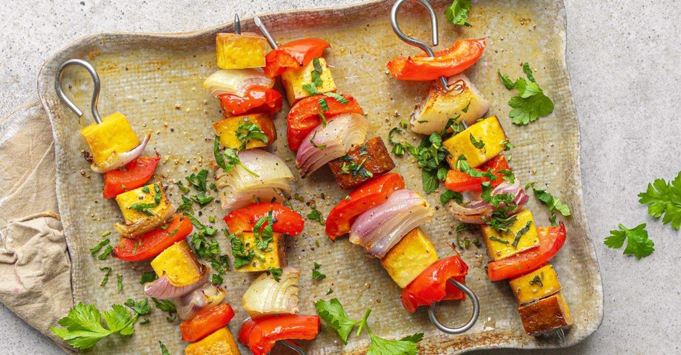 Tofu a papriky nakrájejte na kostičky, cibuli nakrájejte na čtvrtky. Vložte do marinády a vše promíchejte. Pak napichujte na špízy.