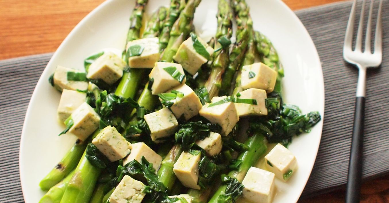V pánvi rozehřejeme zbylý olej, přidáme medvědí česnek a krátce podusíme. Vmícháme tofu a společně necháme ohřát. Poté podáváme s grilovaným chřestem.