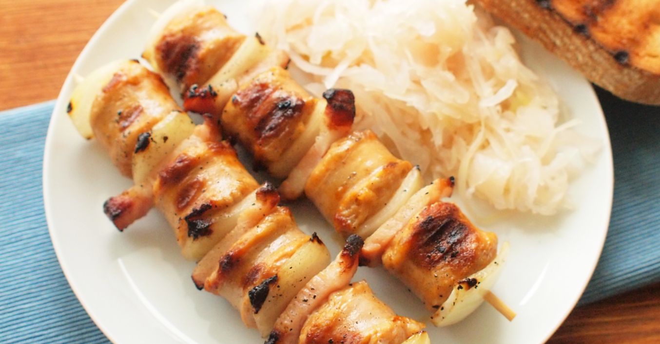 Grilovací klobásky nakrájíme na silnější kolečka. Slaninu nakrájíme nejprve na plátky a poté na čtverečky. Cibuli oloupeme, podélně rozčtvrtíme a poté rozdělíme na dílky.