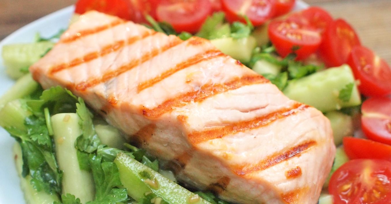 Připravené díly lososa grilujeme z obou stran na rozpáleném grilu nebo na grilovací pánvi (dohromady asi 6 až 8 minut). Poté přesuneme mimo přímý žár a necháme dojít v teple (asi 5 až 10 minut podle výšky filetu). Podáváme spolu s okurkovým salátem.