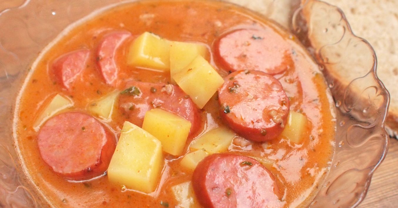 Cibuli oloupeme a nakrájíme nadrobno. Česnek prolisujeme. Maso nakrájíme na malé kostičky. Brambory oloupeme a nakrájíme na kostky. Klobásky nakrájíme na tenká kolečka.