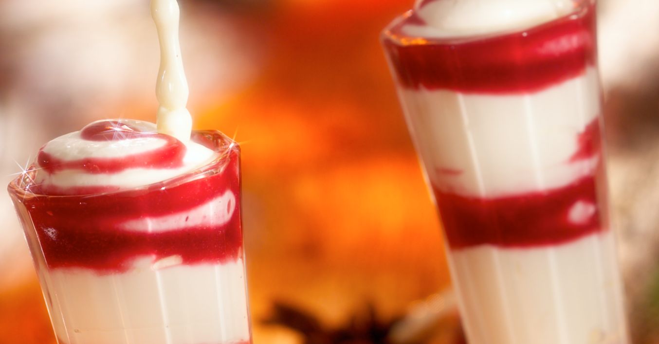 Tvarohovou směs plníme do vyšších úzkých sklenic na střídačku s ovocným pyré.