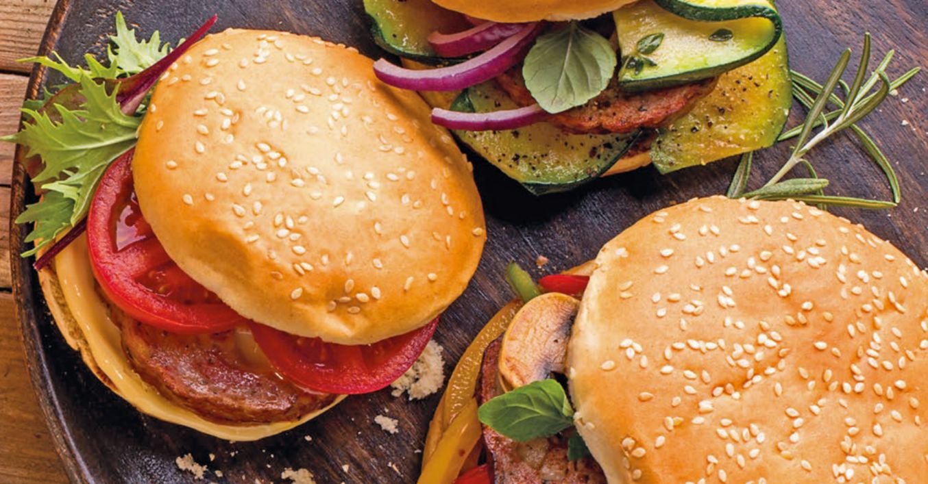 Hamburger zkompletujeme tak, že na spodní část dáme majonézu, poté sekanou, cuketové plátky, restovanou cibuli a přiklopíme.