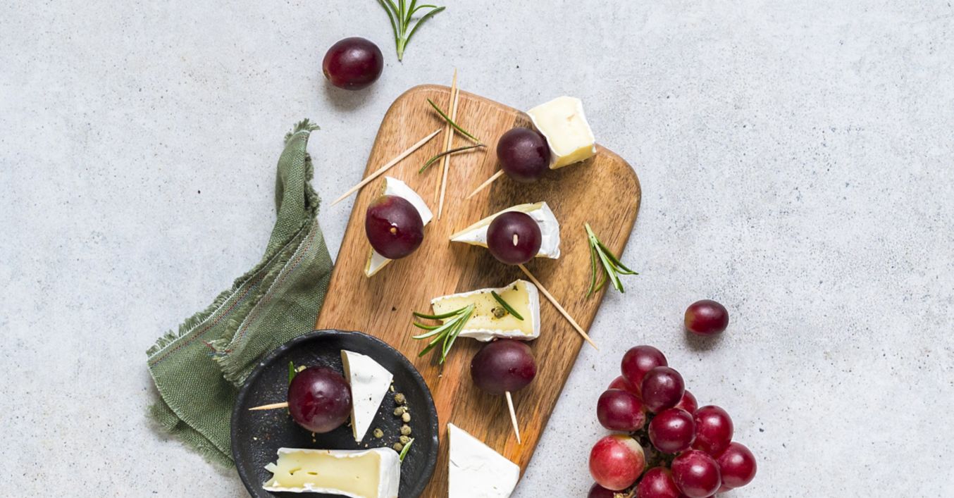 Hermelín nakrájejte na trojúhelníky. Ty napíchněte na párátka s hroznovým vínem.