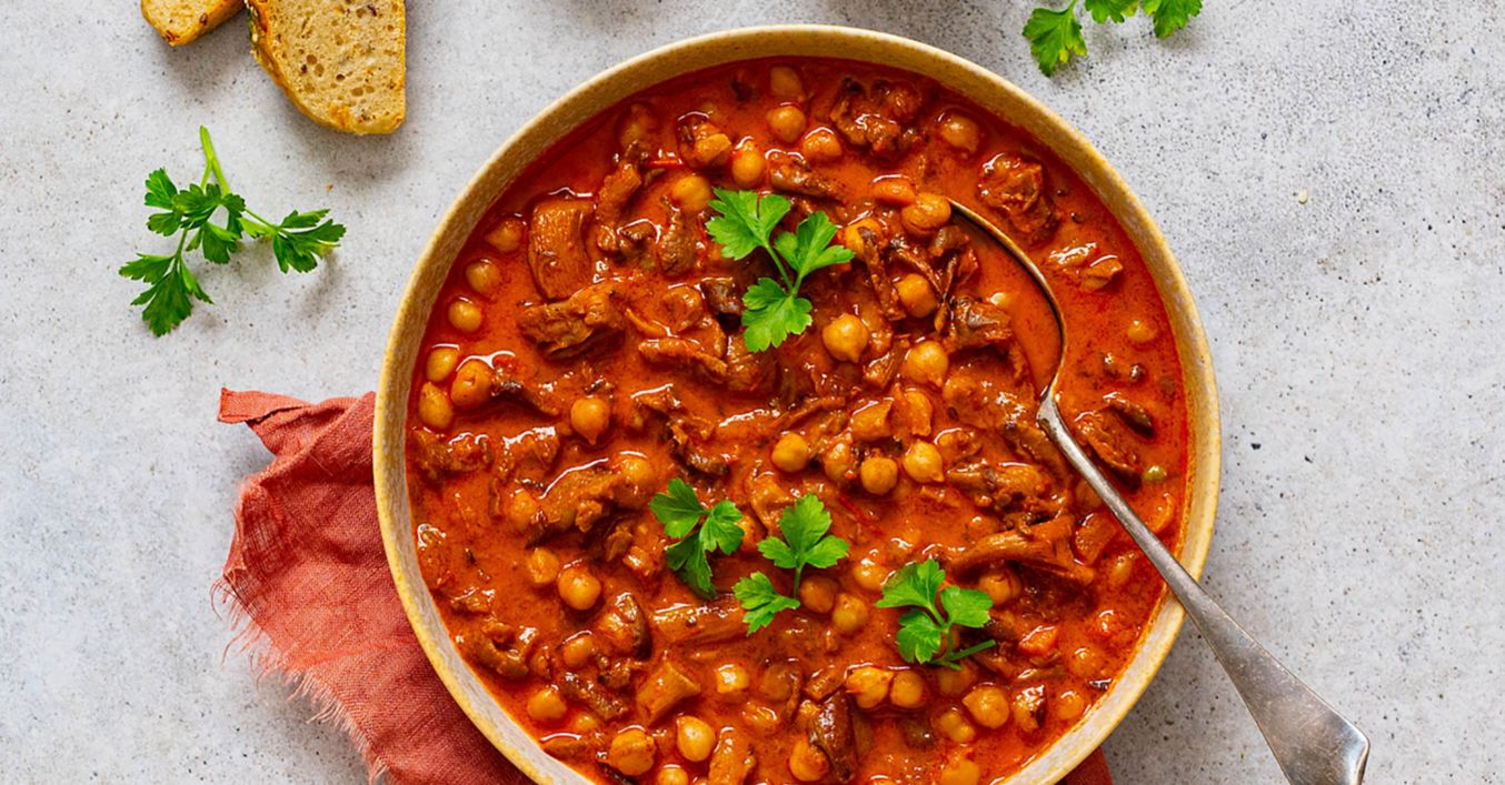 Přimíchejte hlívu a restujte 5 minut. Pak přidejte papriku, kmín, protlak, vývar, majoránku a cizrnu. Vařte 20 minut.