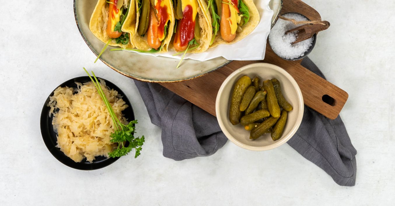 Vezměte tacos a přidejte 2-3 lžíce kysaného zelí, cibuli a plátek okurky.