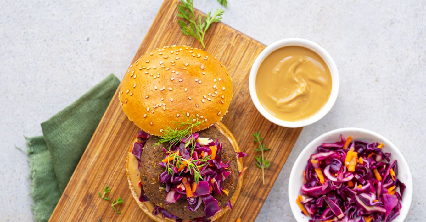 Hovězí burger s arašídovým dresingem a zelným salátem