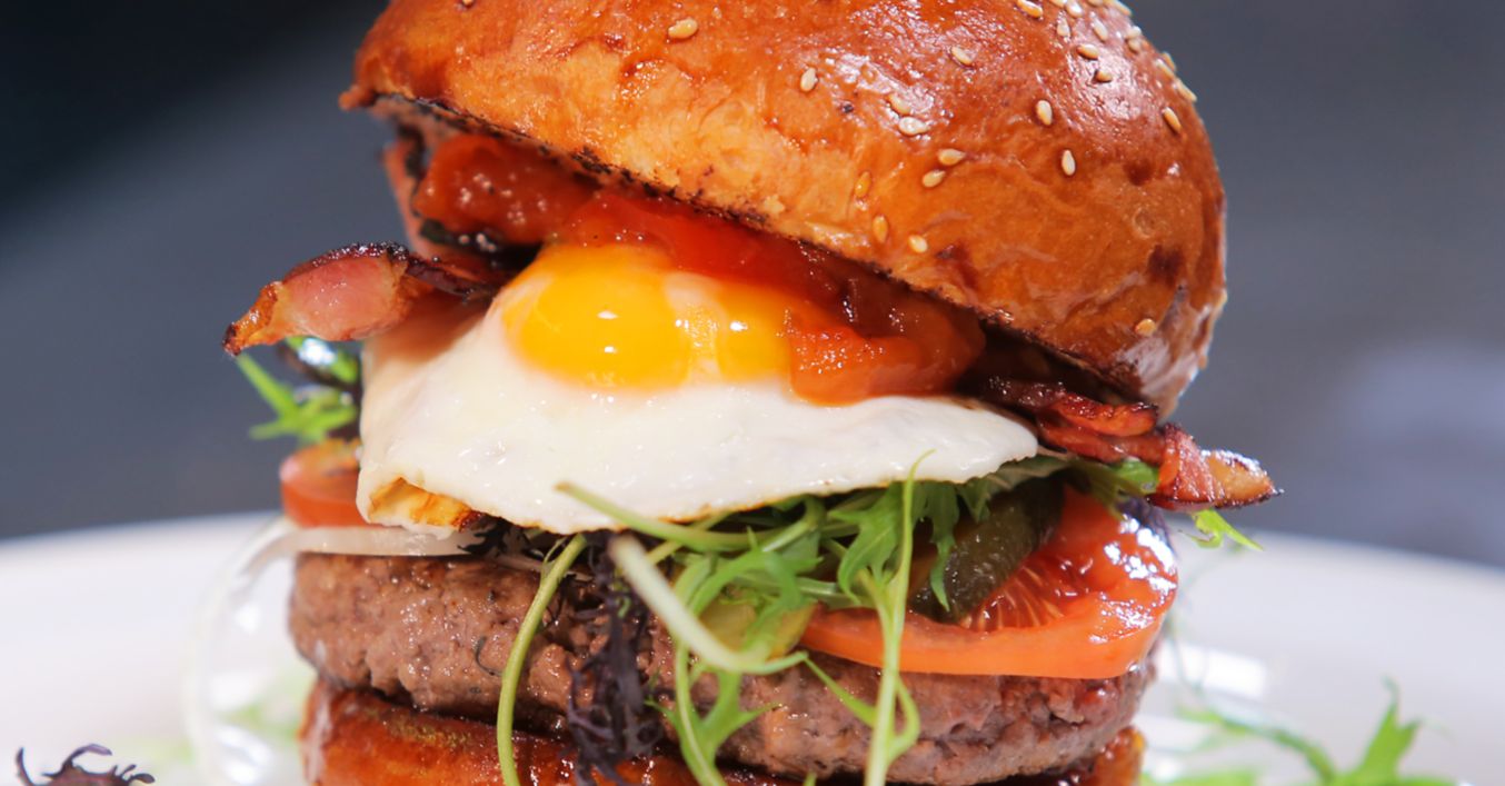 Pak už jen kompletujeme, spodní část opečené housky namažeme domácím kečupem, přidáme maso, cibuli, rajčata, okurku, salát, vejce, slaninu a přiklopíme vrchní částí bulky namazanou zase domácím kečupem.