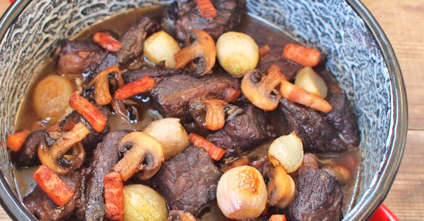Přidáme 2 lžíce oleje, šalotku a opečeme ji dozlatova. Přidáme mrkev s celerem a orestujeme asi 5 minut. Vrátíme maso, zalijeme vínem, přidáme vývar, bobkový list a tymián. Přivedeme k mírnému varu bez velkých bublin a dusíme asi 2 až 3 hodiny doměkka.
