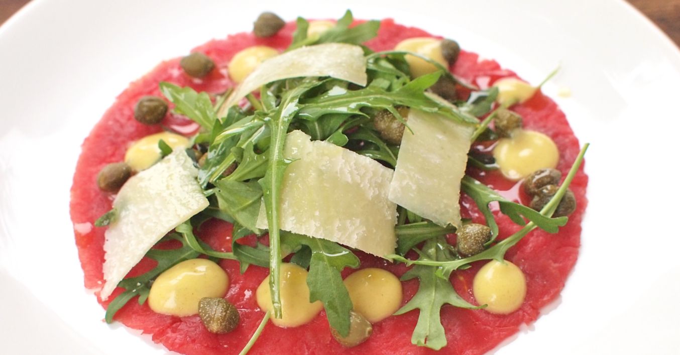 Na talíře pak rozdělíme rukolu, přidáme kapary, hobliny a dozdobíme dresinkem. Podle potřeby dochutíme solí a čerstvě mletým pepřem. Ihned podáváme.