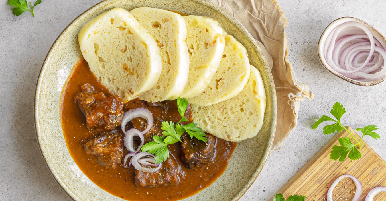 Guláš podávejte s kynutým knedlíkem a na kolečka nakrájenou cibulí.