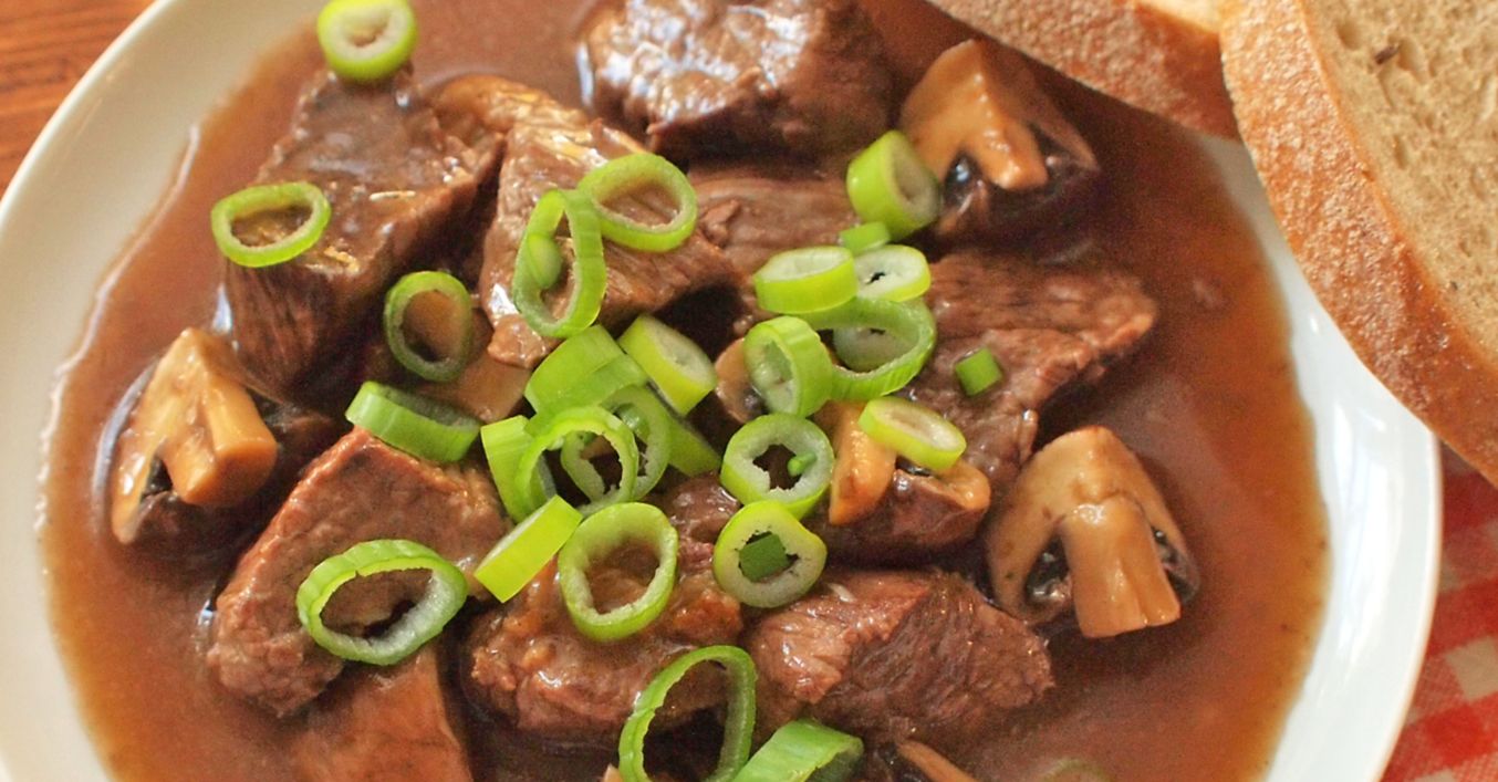Hovězí maso očistíme a nakrájíme na velké kostky. Cibuli oloupeme a nasekáme nadrobno. Žampiony očistíme a nakrájíme na čtvrtiny.