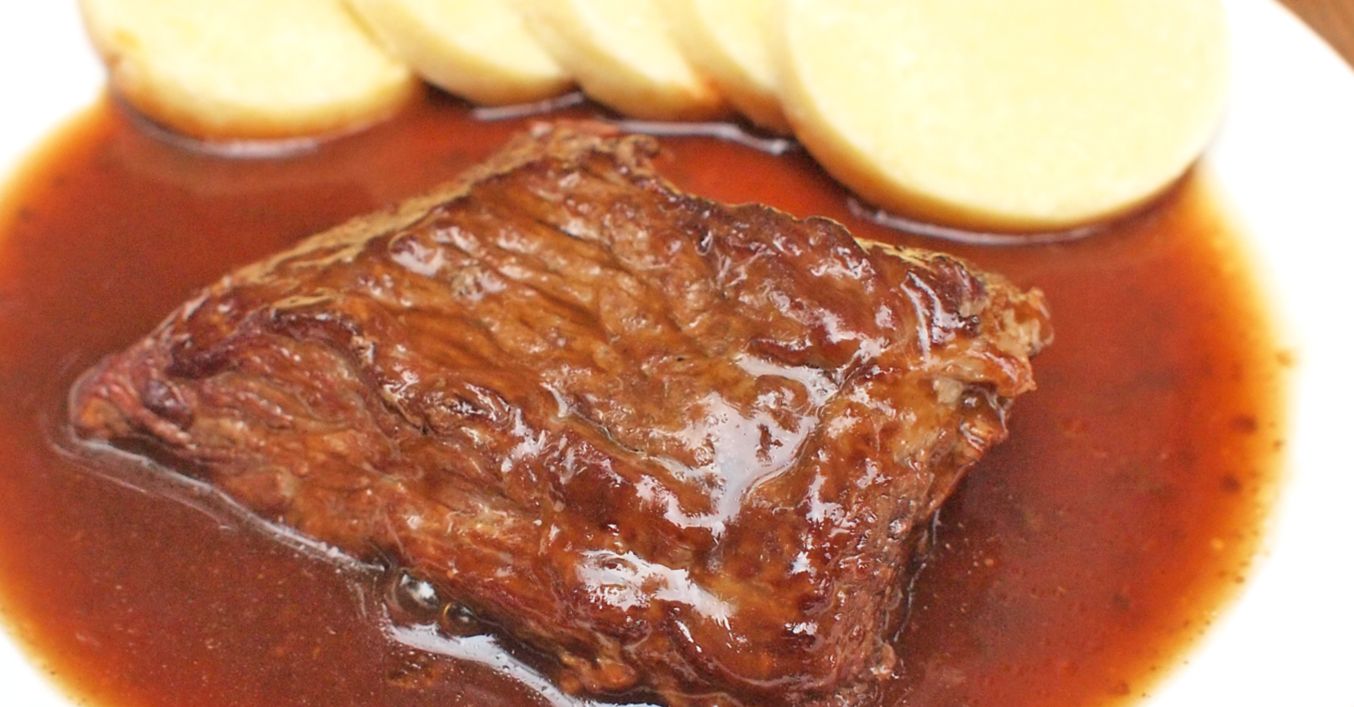 Když je maso měkké, tak jej vyjmeme a uložíme stranou. Omáčku scedíme a v rendlíku svaříme na polovinu objemu. Do omáčky vložíme díly masa, společně prohřejeme a podáváme.