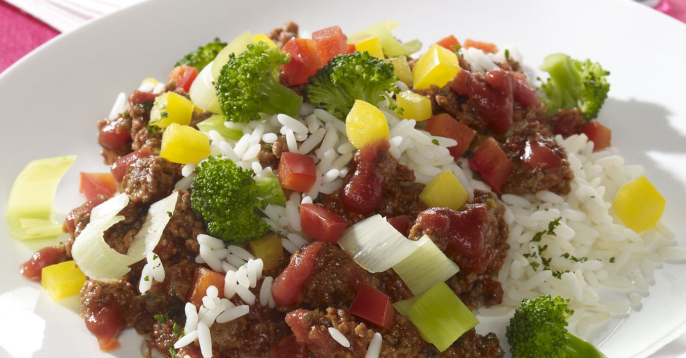 Na rozehřátém oleji osmahneme mleté maso, dochutíme solí, pepřem a paprikou. Přidáme scezenou zeleninu, jarní cibulku, rajskou omáčku, petrželku a podusíme asi 5 minut. Naposledy dochutíme a podáváme s rýží.