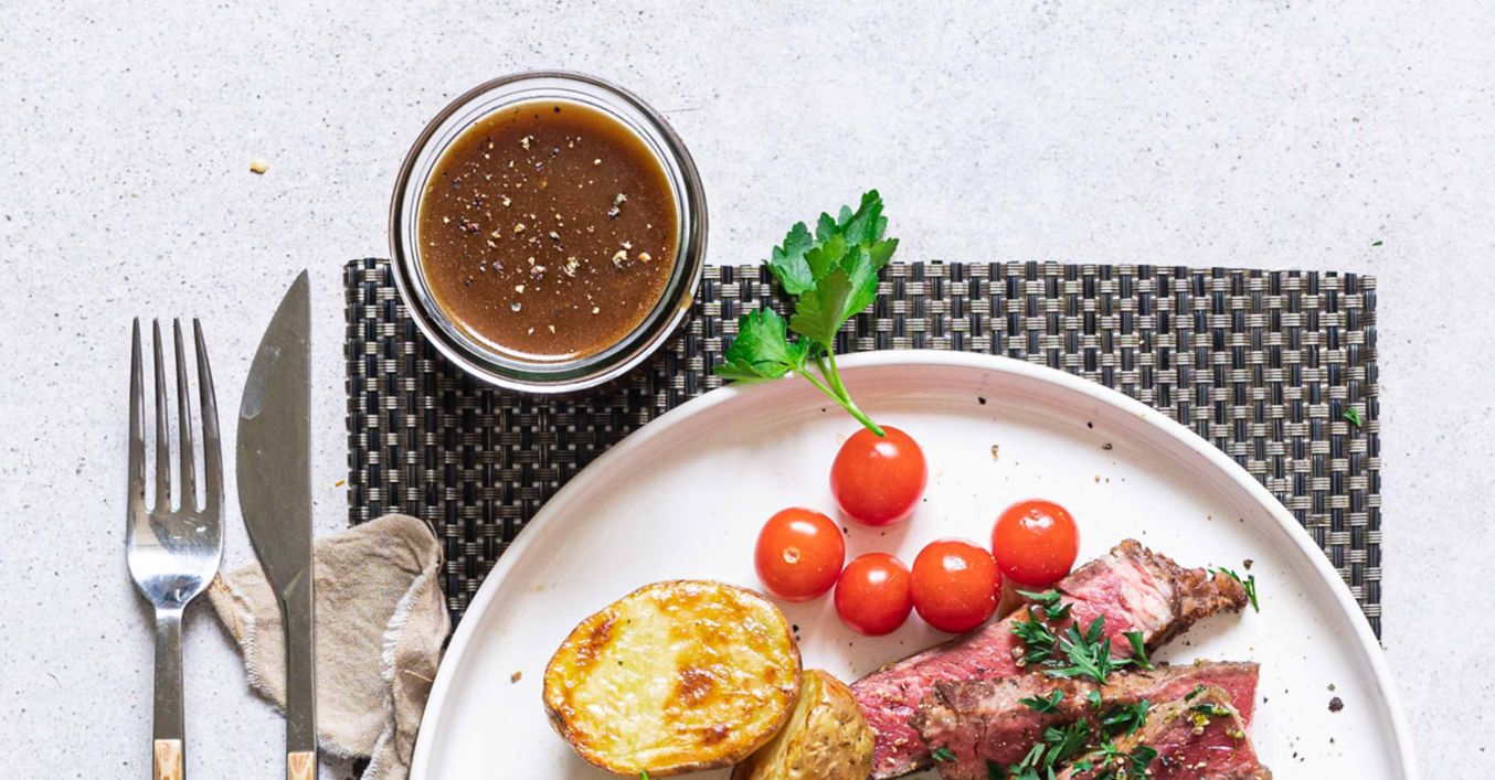 Steak podávejte s připravenou omáčkou, pečenými bramborami a čerstvými bylinkami.