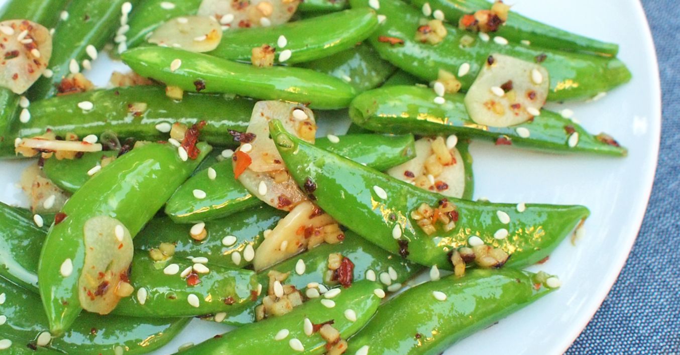 Sezam nasucho opražíme na pánvi. Česnek oloupeme a nakrájíme na tenké plátky. Zázvor oloupeme, podrtíme plochou nože a nakrájíme nadrobno. Hrášek očistíme.