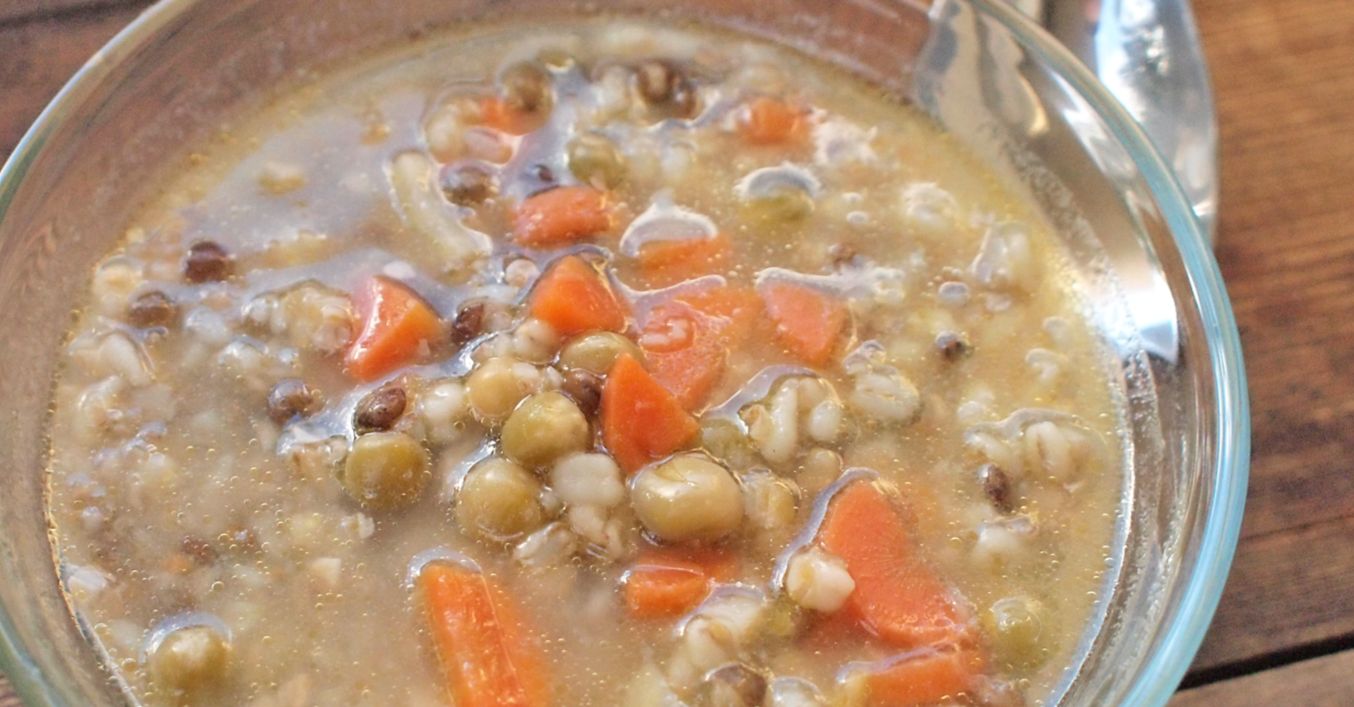 Zalijeme vodou, přidáme luštěniny, kroupy a vaříme do změknutí. Ke konci dochutíme a podáváme.