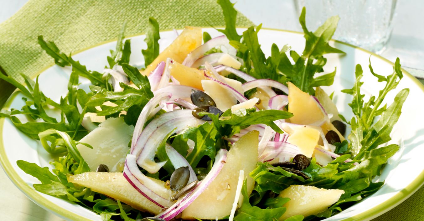 Na talíř poté rozprostřeme rukolu, červenou cibuli a díly hrušek. Vše zakápneme zálivkou a dozdobíme hoblinami parmazánu a dýňovými semínky.