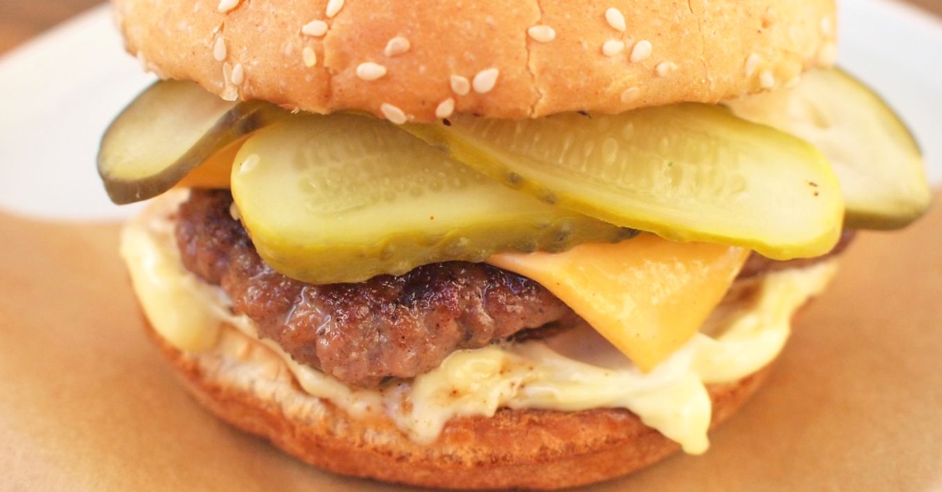 Žemle opečeme na pánvi po burgerech. Přidáme majonézu s okurkou, burger se sýrem a podáváme.