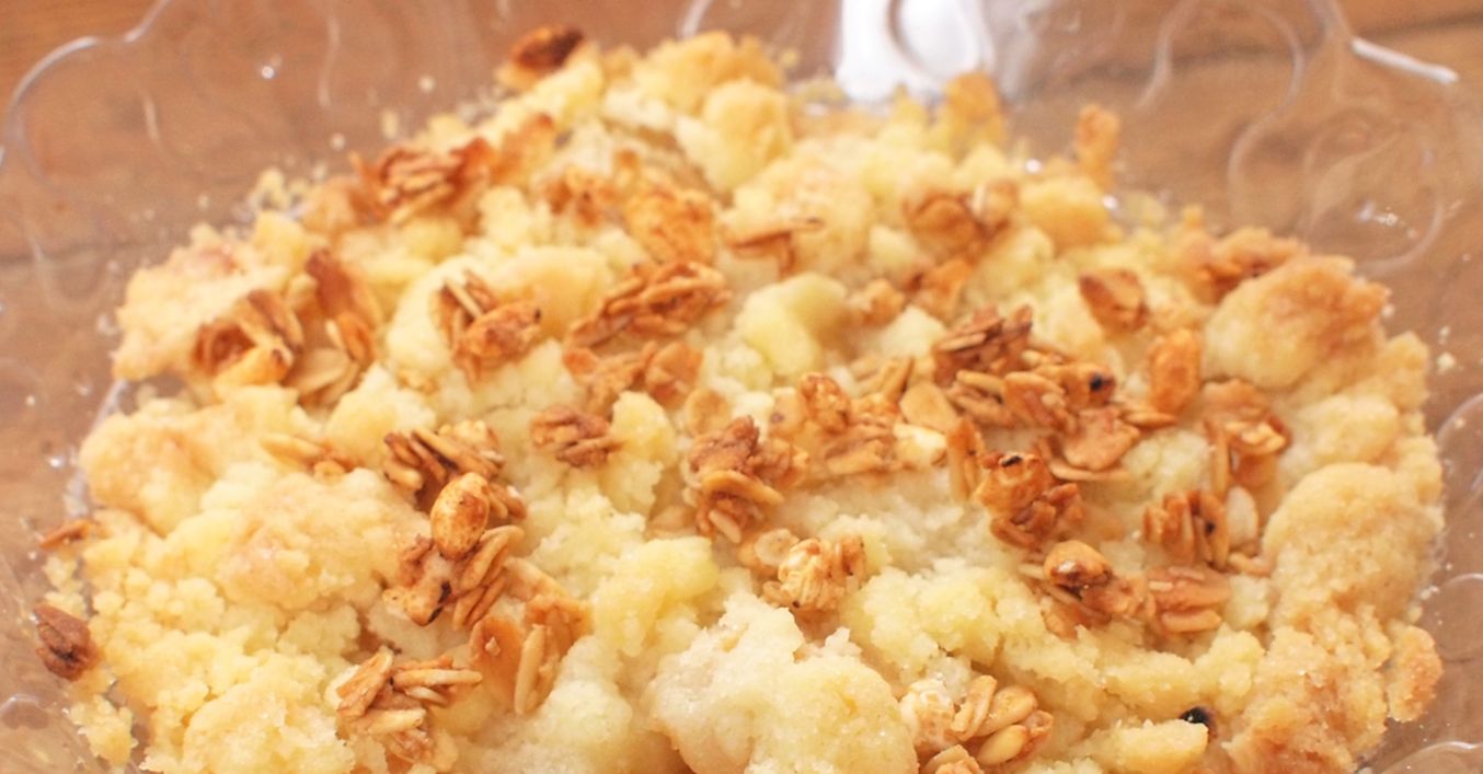 Mouku, cukr a studené máslo na kostky zpracujeme na drobenku. Tu rozprostřeme na jablka a dáme péct do trouby rozehřáté na 180 °C. Pečeme asi 30 až 45 minut dozlatova.