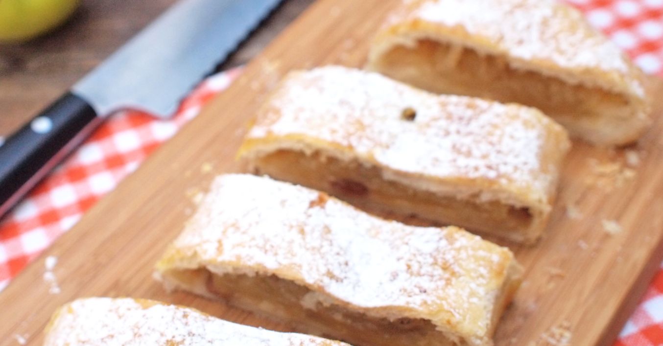 Jablka smícháme v míse s rozinkami, vlašskými ořechy a skořicí. Jablečnou náplň poté uspořádáme doprostřed těsta do tvaru obdélníků. Nahoře jablka zasypeme strouhankou a těsto kolem jablek zabalíme. Švy potřeme vodou a stiskneme. Přebytečné kusy těsta odkrojíme.