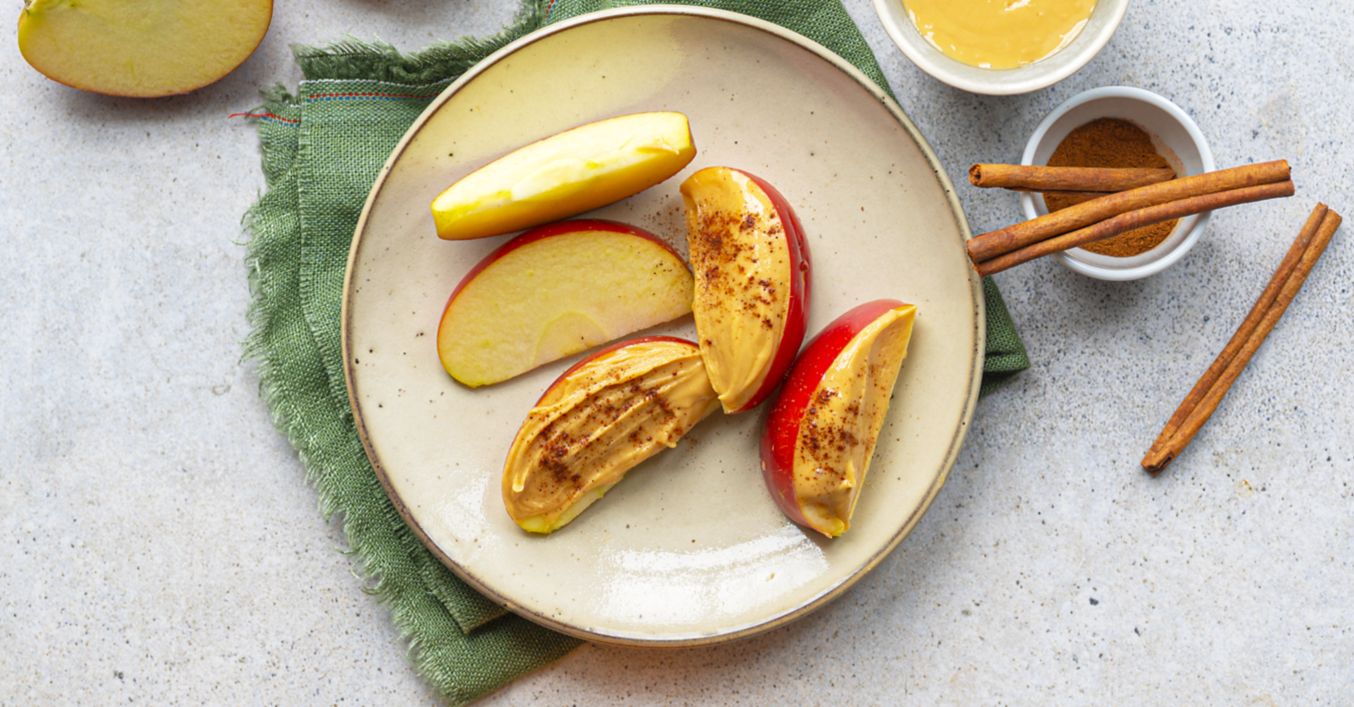 Jablko nakrájejte na měsíčky. Každý potřete arašídovou pomazánkou a posypte skořicí.