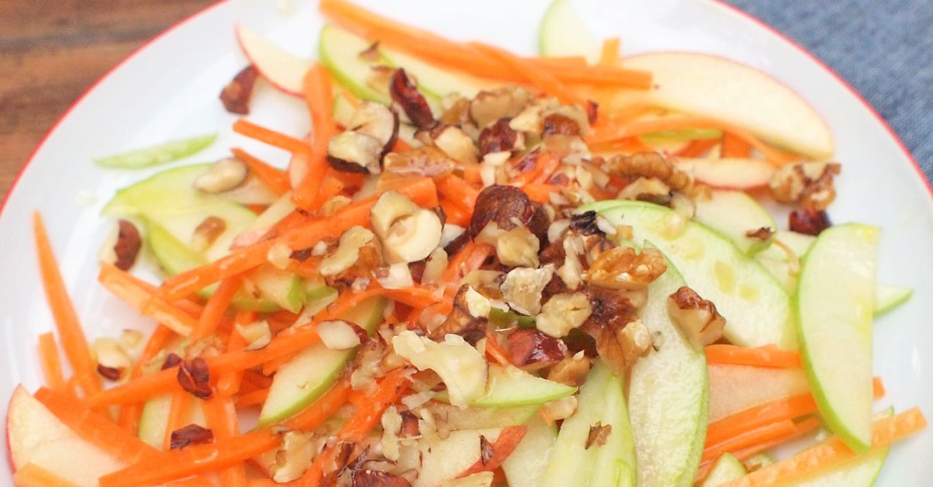 Jablka očistíme, zbavíme jádřinců a nakrájíme na tenké plátky. Mrkev oloupeme a nakrájíme na tenké nudličky (popř. ji můžeme i nastrouhat). Ořechy nasucho opražíme na pánvi a nahrubo nasekáme.