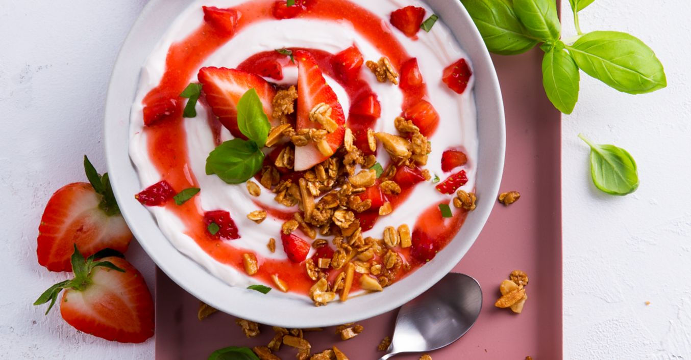 50 g jahod rozmixujeme s javorovým sirupem na hladké pyré. Zbylé jahody nakrájíme na kostičky a bazalku nasekáme na tenké nudličky. Tvaroh pak smícháme s jahodovým pyré, kostičkami jahod a bazalkou.