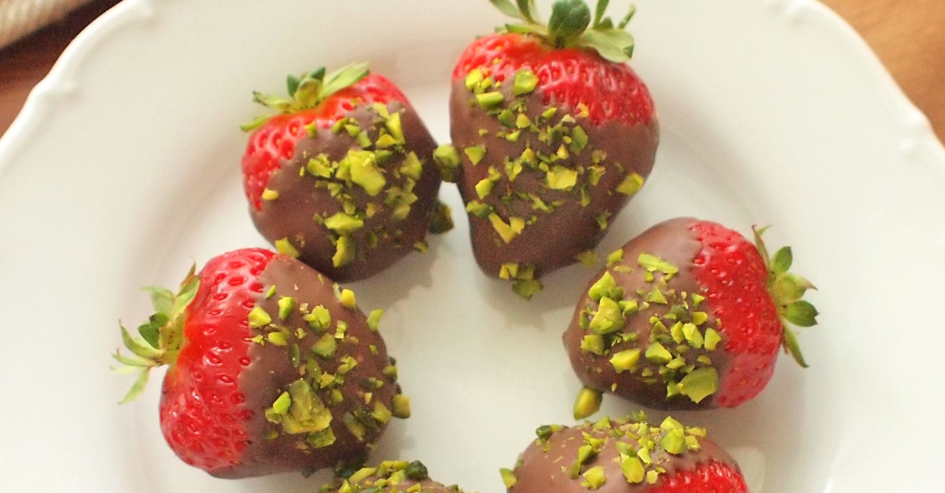 Jahody poté namáčíme do čokoládové polevy. Přeneseme na mřížku a zasypeme trochou sekaných pistácií. Necháme vychladnout, aby čokoláda ztuhla, a podáváme.