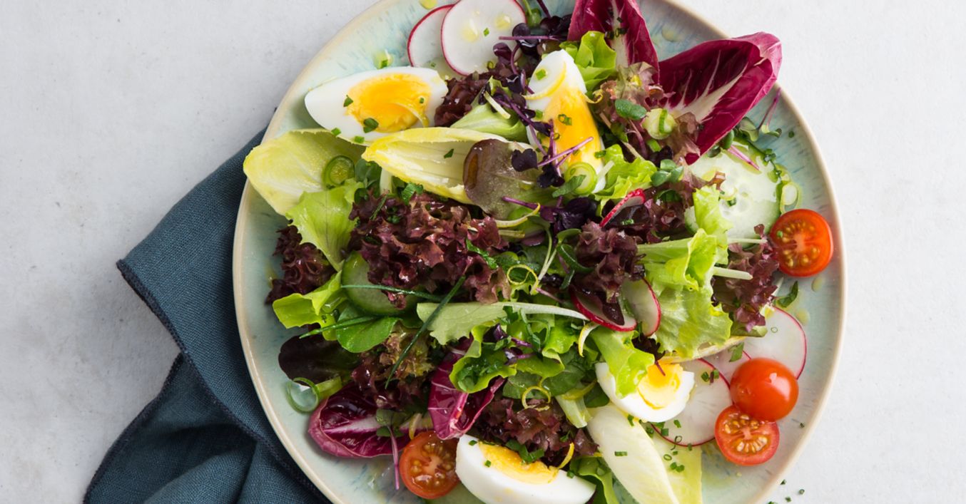 Natrhaný salát a listy čekanky smícháme s ředkvičkami, okurkou, jarní cibulkou a cherry rajčaty. Zakápneme citronovou zálivkou a podáváme ozdobené vejci.