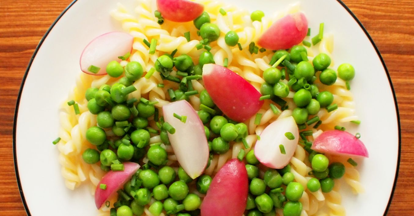 V pánvi rozehřejeme lžíci másla, přidáme šalotku a necháme zesklovatět. Přidáme ředkvičky, hrášek, zbylé máslo a podlijeme vývarem. Přivedeme k mírnému varu a podusíme asi 10 minut. Vmícháme těstoviny, bylinky a podáváme.