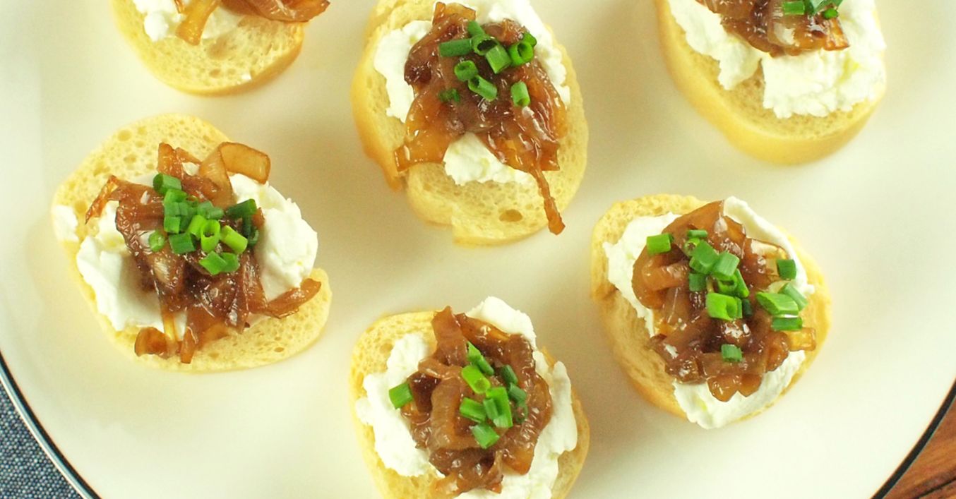 Bagetu nakrájíme na plátky, potřeme kozím sýrem a završíme karamelizovanou cibulkou.