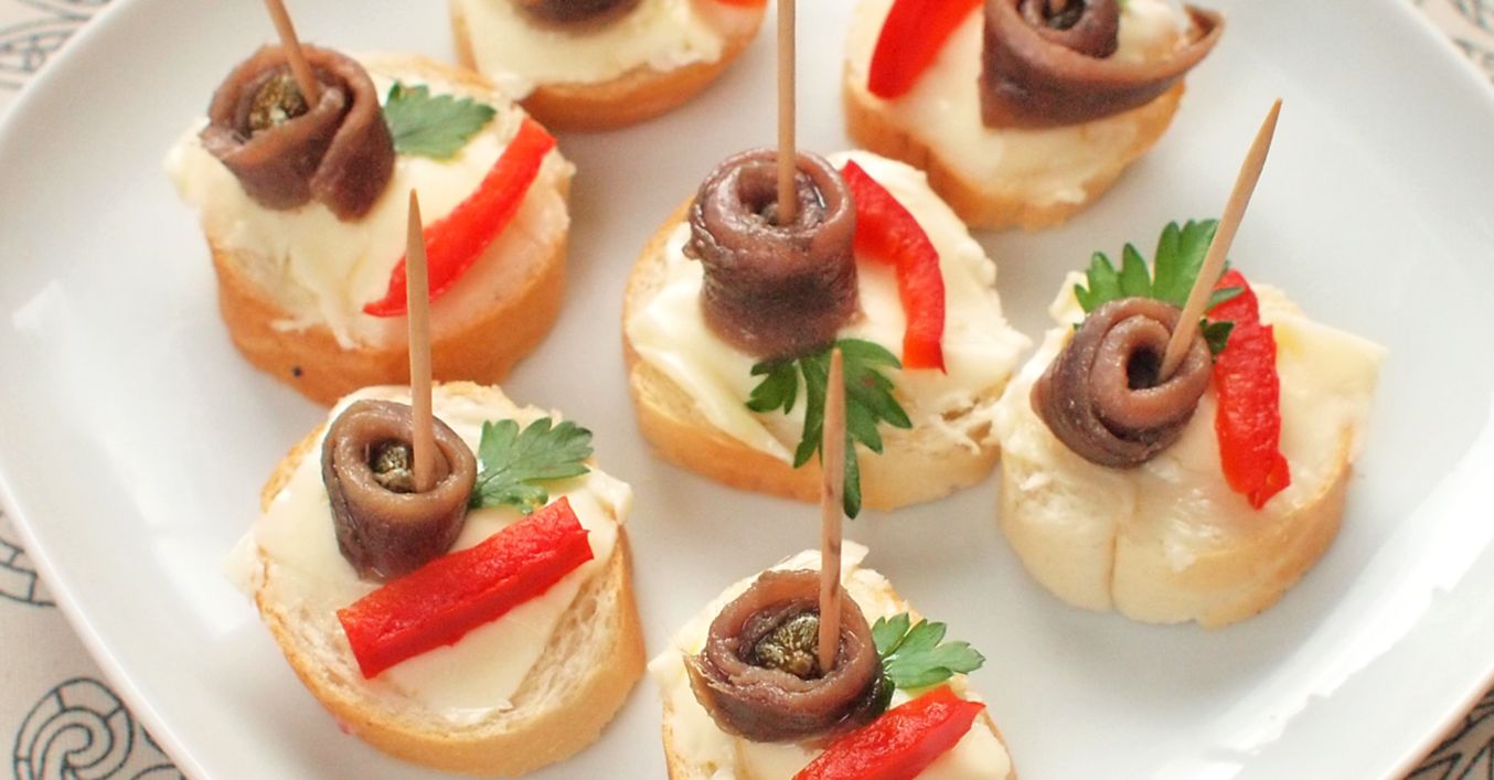 Ančovičky stočíme, přidáme na plátek rohlíku a do středu vložíme kapary.