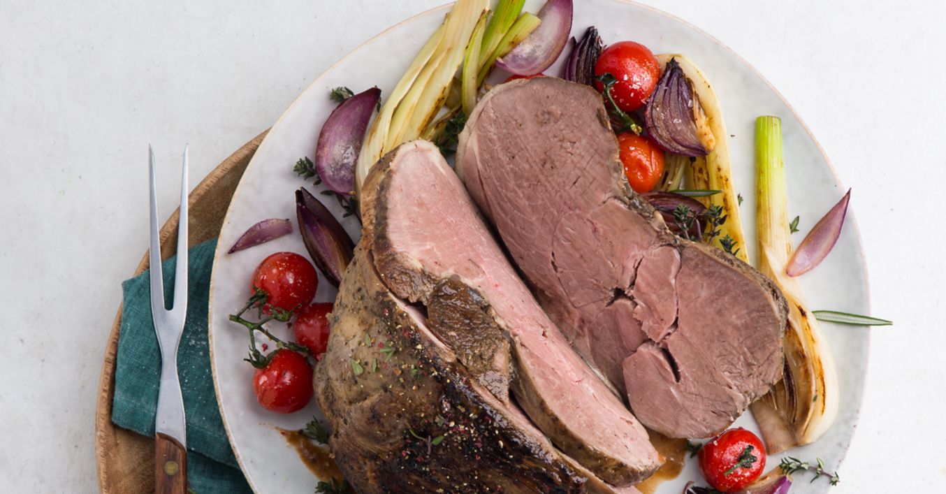 Jehněčí kýtu nakrájíme na plátky, přelijeme šťávou z masa a podáváme s pečenou zeleninou nebo baby brambůrkami.