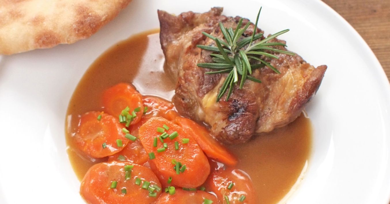 Zeleninový základ poté zastříkneme vínem, vrátíme k němu maso a podlijeme vodou tak, aby bylo maso zčásti ponořené. Přidáme rozmarýn a na mírném plameni pomalu dusíme asi 2 hodiny do změknutí.