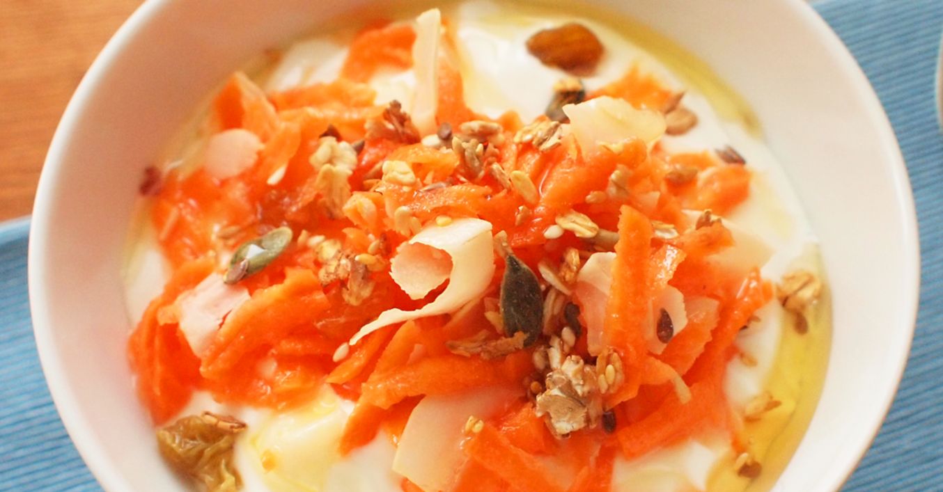 Jogurt rozdělíme do misek, přidáme směs s mrkví a podáváme.