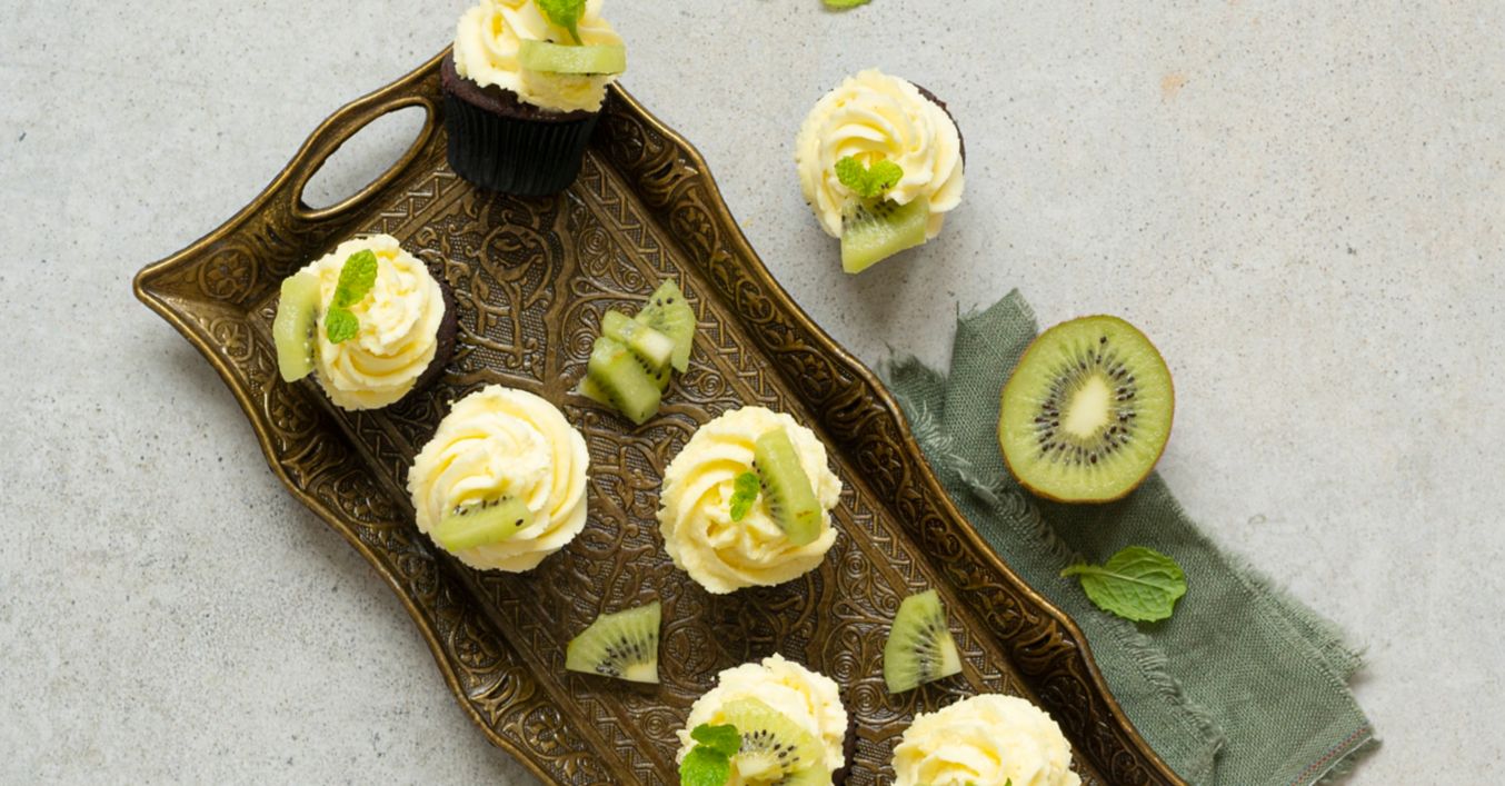 Po upečení nechte cupcakes úplně vychladnout, pak ozdobte krémem, nakrájeným ovocem a čerstvou mátou. Uchovávejte v lednici.