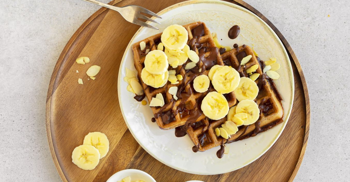 Vafle opékejte v rozehřátém vaflovači dokřupava. Podávejte s čokoládovou polevou, banánem a plátky mandlí.