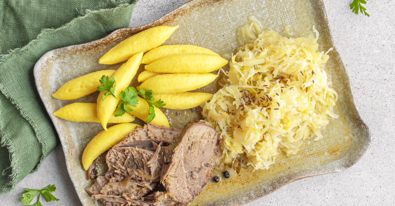 Upečené maso podávejte se zelím, bramborovými šiškami a čerstvou petrželkou.