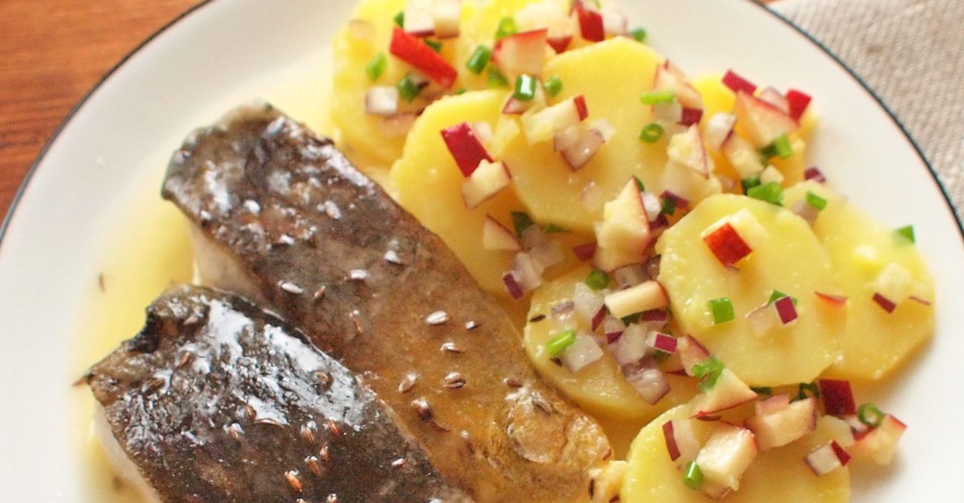 Brambory uvaříme ve slupce doměkka (asi 25 minut), scedíme a oloupeme. Jablko očistíme a nakrájíme na malé kostičky. Šalotku oloupeme a nasekáme nadrobno.