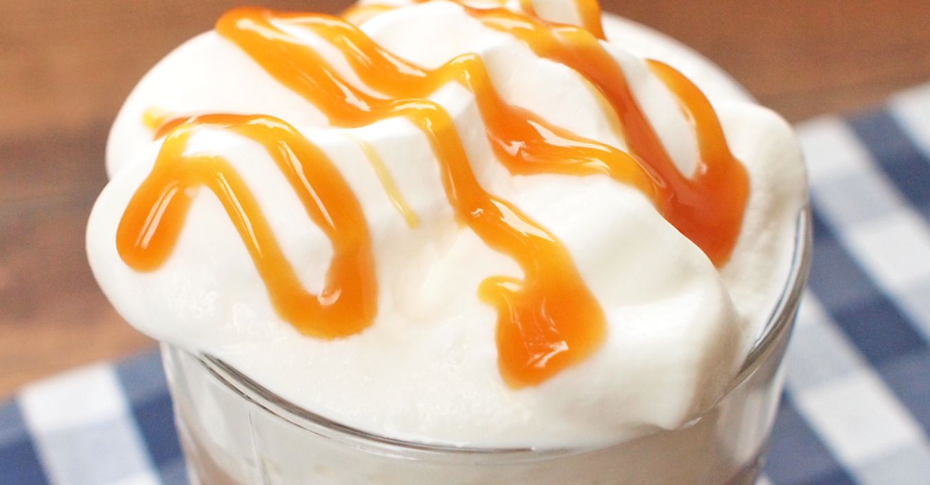 Do šálku (nebo sklenice) dáme espresso, přidáme horké mléko a opatrně přidáme šlehačku, kterou ozdobíme karamelem.