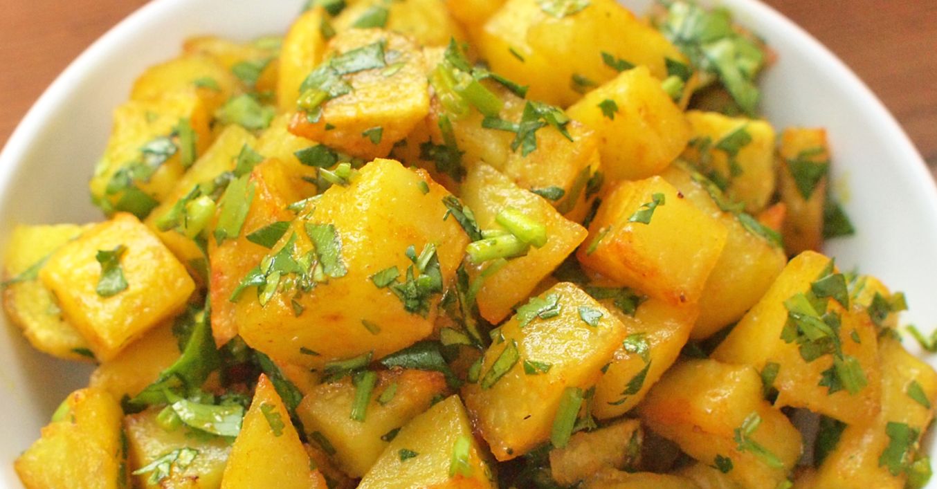 Hotové brambory zbavíme tuku a dáme do mísy. Promícháme spolu s kari kořením a nasekaným koriandrem.