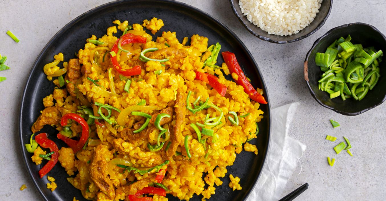 K masu a zelenině přidejte uvařenou rýži a kari koření s vodou. Promíchejte.