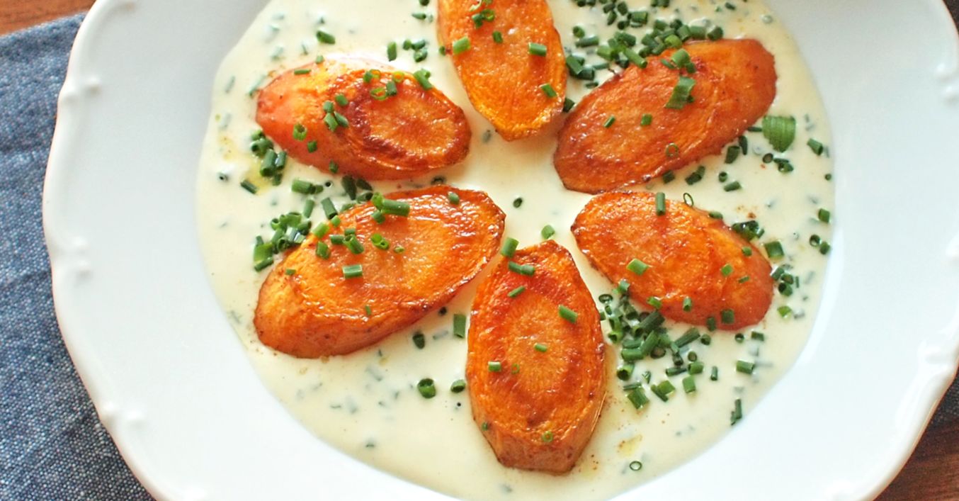 Karotku nakrájíme na plátky a osmahneme v rozehřátém olivovém oleji dozlatova. Do omáčky vmícháme bylinky a smetanu. Krátce povaříme a podáváme spolu s karotkou.