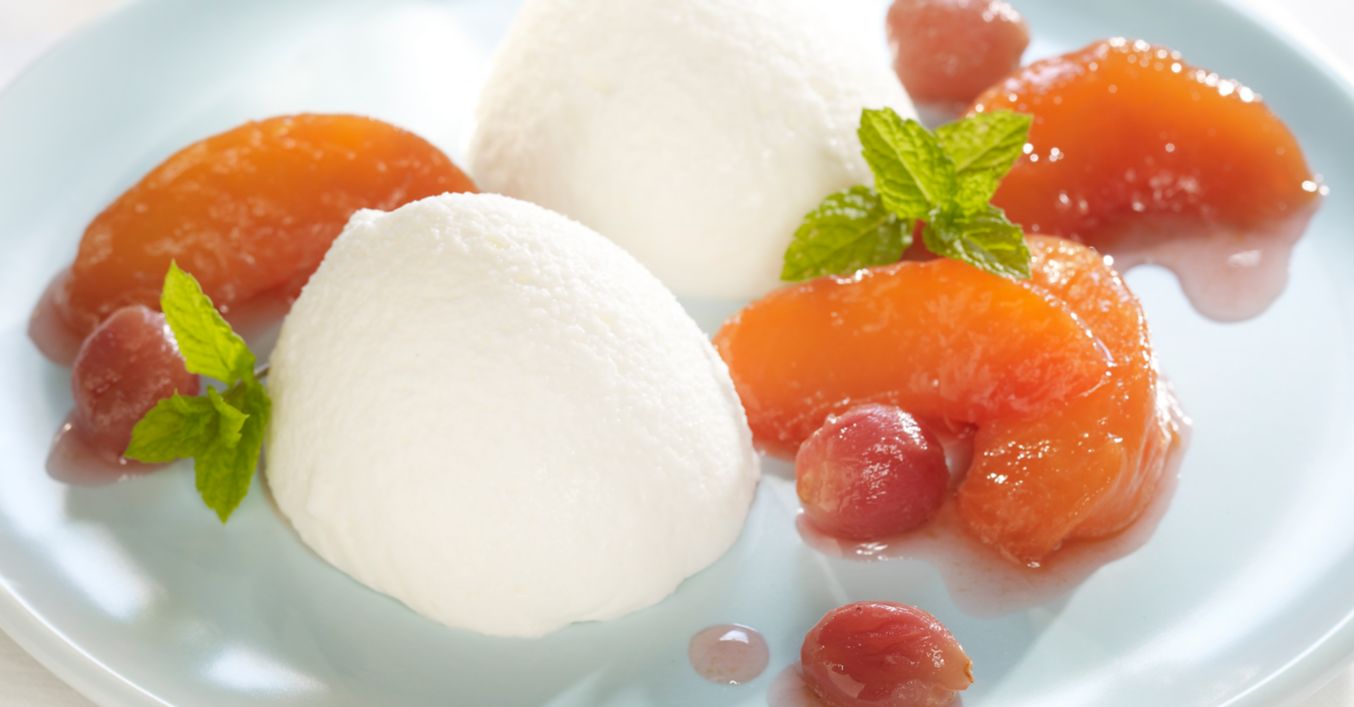 Jakmile začne směs tuhnout, vmícháme i našlehanou šlehačku a necháme další hodinu v lednici. Z vychlazené směsi poté tvarujeme kopečky, které podáváme s ovocným kompotem. Zdobíme mátou.