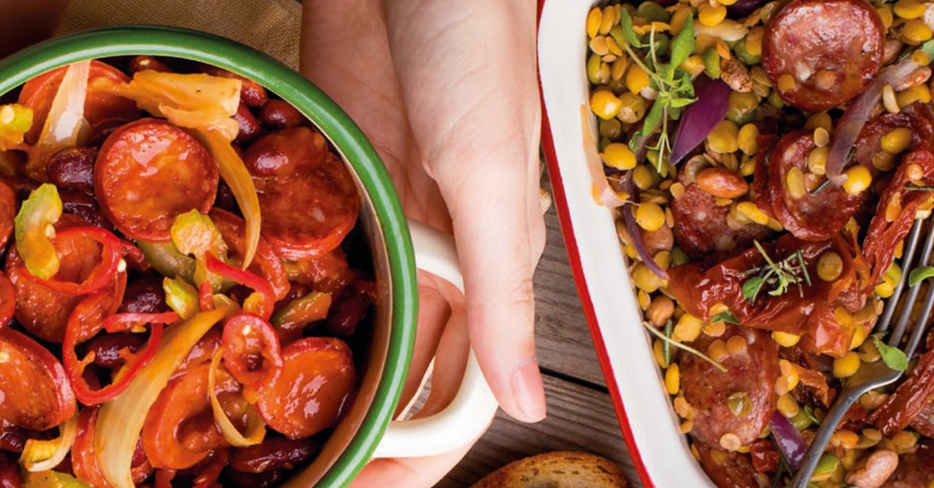 Cibuli restujeme na olivovém oleji, po chvilce přidáme na kolečka nakrájenou klobásu, chvíli restujeme. Přidáme česnek, sušená rajčata. Chvíli restujeme a přidáme luštěniny. Mírně podlijeme horkou vodou a promícháme. Na závěr dáme čerstvou majoránku. Kdo má rád ostřejší chuť použije chilli papričky.