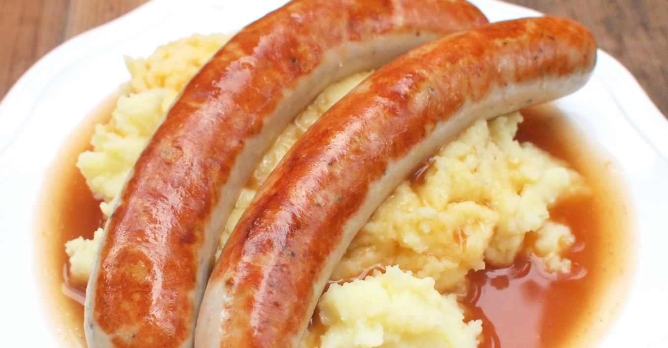 Klobáska s bramborovu kaší a cibulovou omáčkou